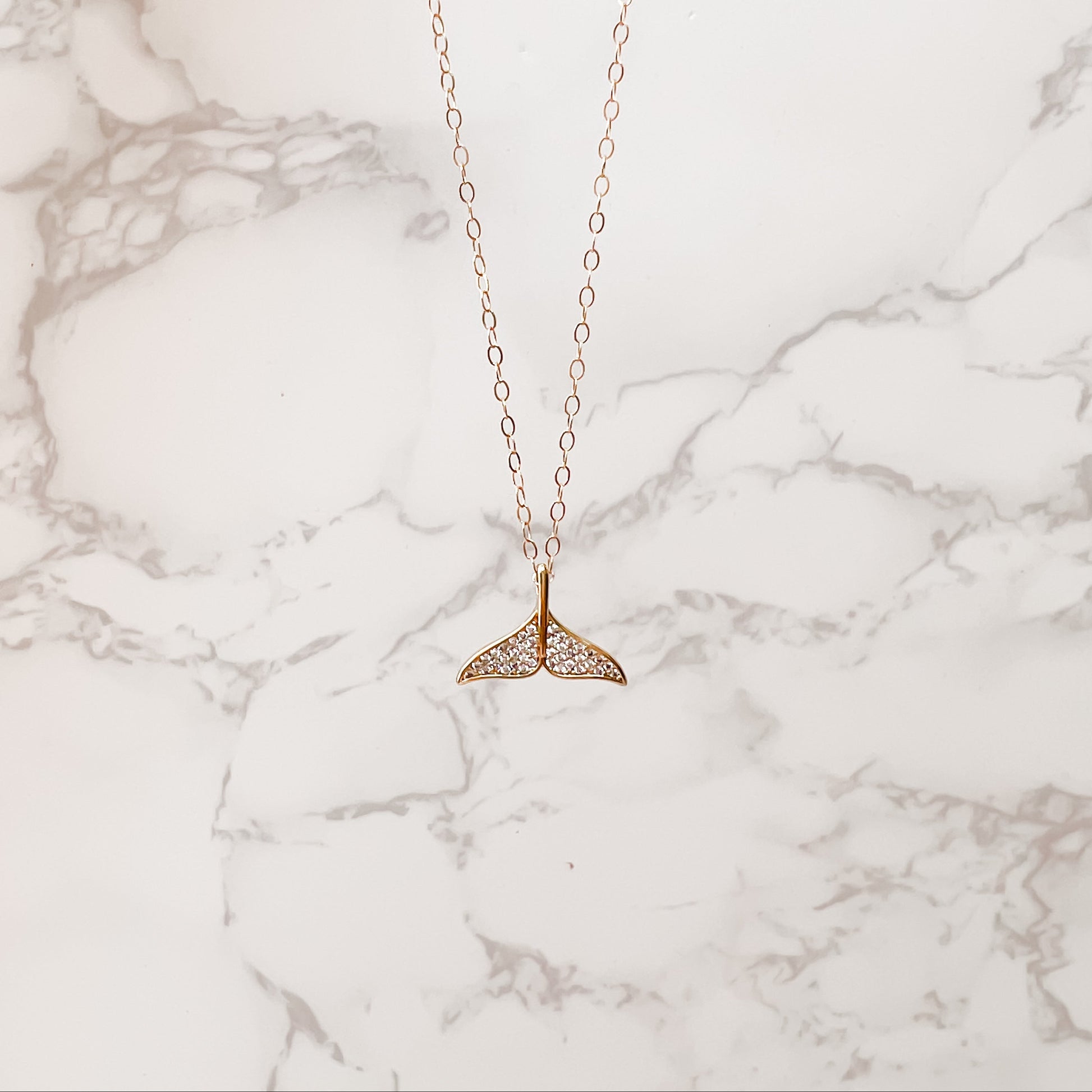Glittering whale or dolphin tail charm on 17" gold filled chain